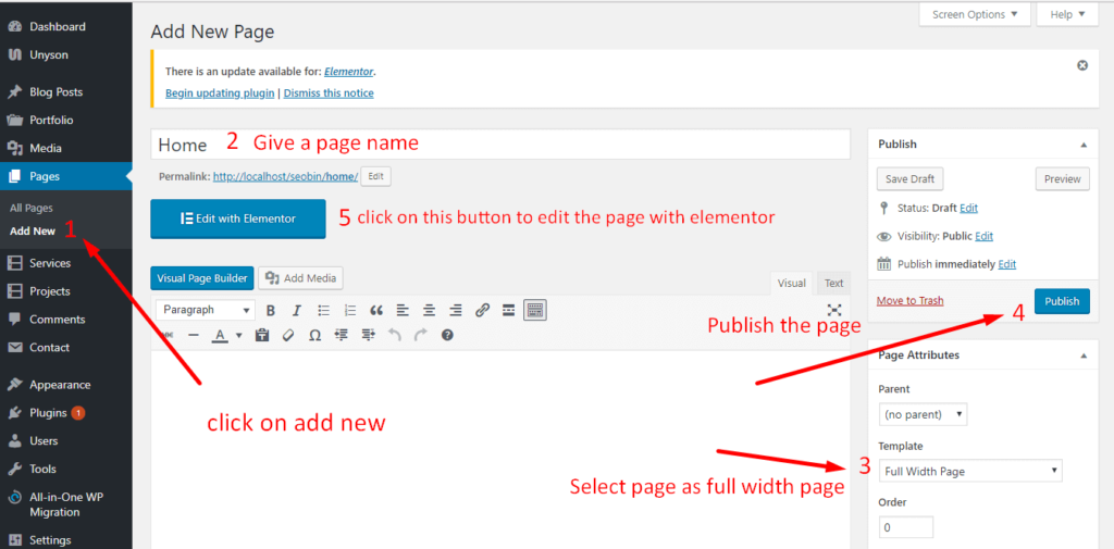 To start working with Elementor, go to the WordPress dashboard. Then, add a new page by clicking on Pages > Add New. Then, create a new page and save it with the ‘full width’ template or home page template and then click on the ‘Edit with Elementor’ button.